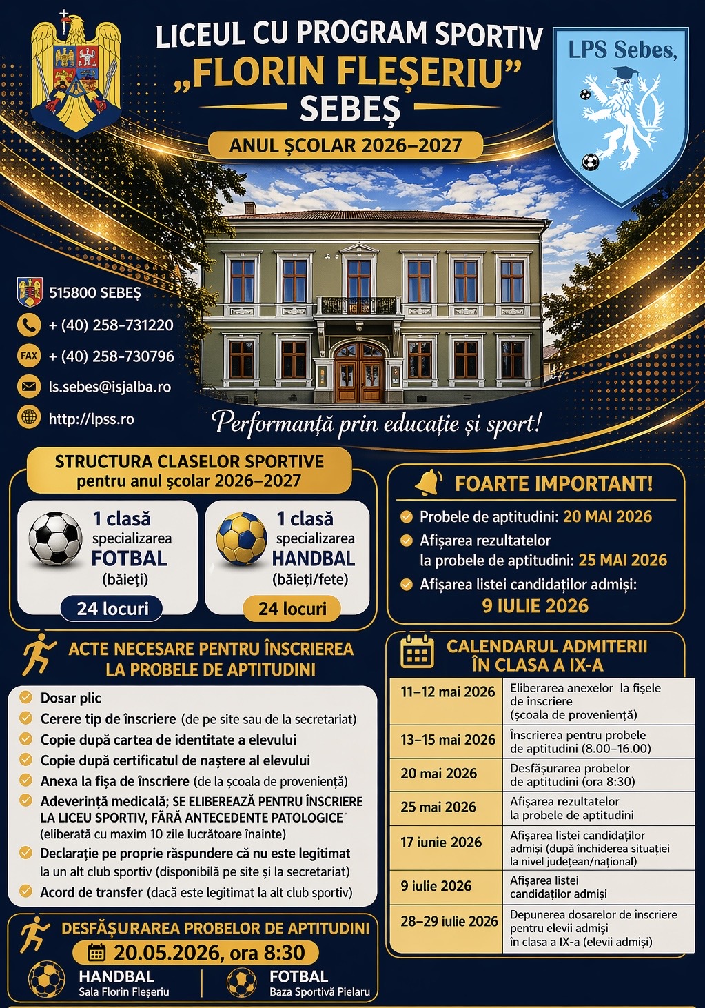 Liceul cu Program Sportiv "Florin Fleșeriu" Sebeș vă oferă posibilitatea să faceți parte dintr-o instituție în care sportul și învățătura se îmbină într-un mod fericit, adăugându-se și mult divertisment prin activitățile extracurriculare desfășurate aici. Liceul beneficiază de un colectiv de cadre didactice bine pregătit, în majoritate titulare ale instituției noastre, cu rezultate bune și foarte bune la Concursurile și Olimpiadele școlare, dar și la examenele naționale: Testarea Națională și Bacalaureat.